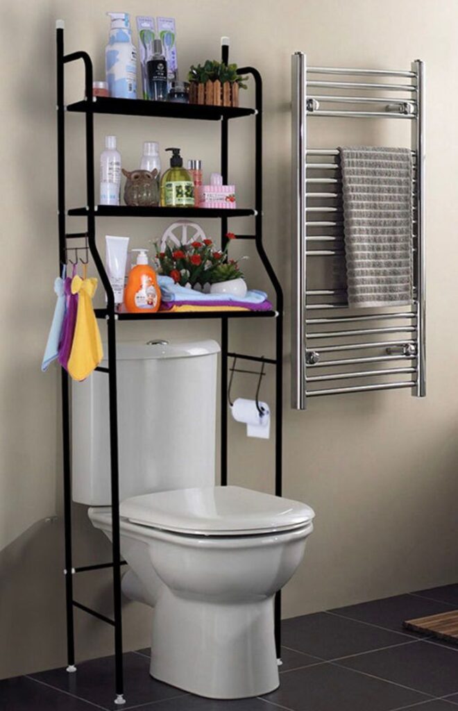 Instead of adding cabinets that take up space, this rack uses the space above your toilet to give you more storage.